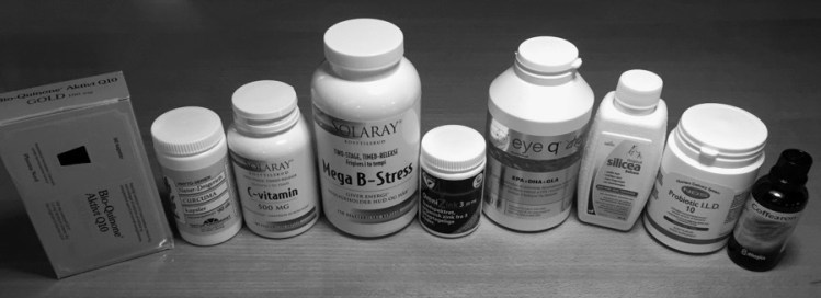 Som vitamin og kosttilskud tager jeg: Fiskeolie, B-stress, Gurkemeje, Multivitamin, Magnesium, C-vitamin, og Zink.